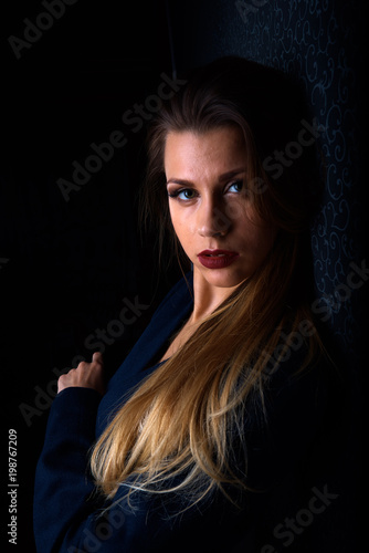 Fototapeta premium Sexy young blonde with red lips on a black background