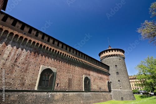 © M. Paolo Grassi, Fototapeta premium Sforza Castle in Milan. Cylindrical tower and walls. The Castle with the walls and the background of the blue sky of a spring day.