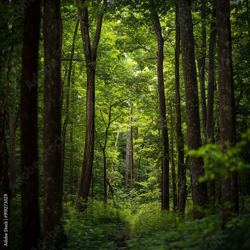 © Adam, Fototapeta premium shaded lush green forest woodlands