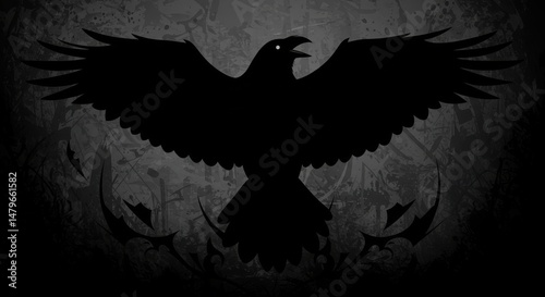 © LiaSyafitri, Fototapeta premium Shadow Crow Wings spread against a mottled sky Mystery in the dark