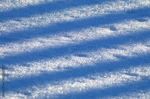 © vladimir subbotin, Fototapeta premium Shadow drawing of a fence on snow in the rays of the setting sun