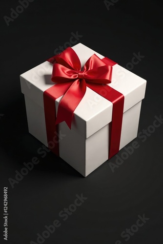 © Prasert, Obraz premium Shadow falls on a present box with red ribbon and bow on black background, red ribbon, wrap