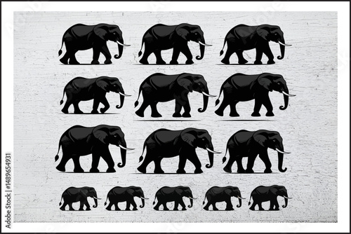 Naklejka premium Shadow Herd: Artistic Elephants, Vector Elephants Collection, Elephant Evolution: From Small to Giant, Bold Elephants: A Graphic Journey