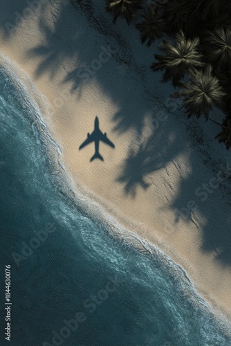Naklejka premium Shadow of Airplane Over Tropical Beach with Palm Shadows