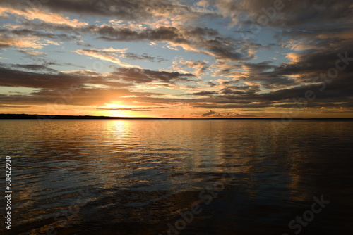 © yarvin13, Obraz premium Shadows and sunlight of sunset on lake water in sky reflection