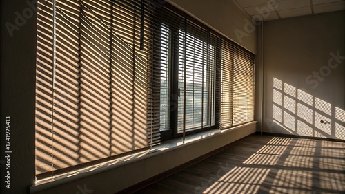 © Dwijamoni, Obraz premium Shadows from Window Blinds Creating Patterns on a Wall