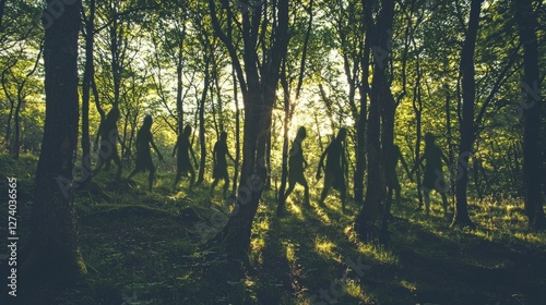 Obraz premium Shadows of Figures Walking Through a Lush Green Forest at Sunrise