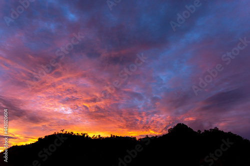 © CoreRock, Fototapeta premium Shadows of mountains, evening sky, red-orange clouds, beautiful clear evening skies empty decks for the text above. image for background