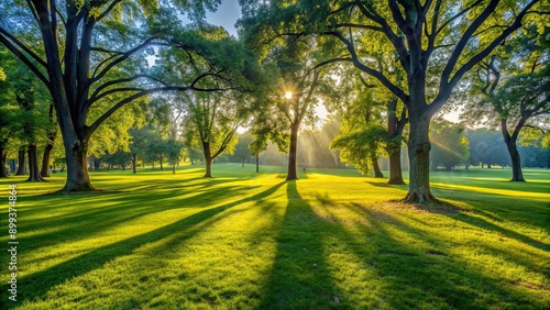 Naklejka premium Shadows of trees on the ground in a park during a sunny summer day, park, shadows, summer, sunlight, trees