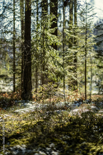 Obraz premium shadows under the trees in winter forest with low snow