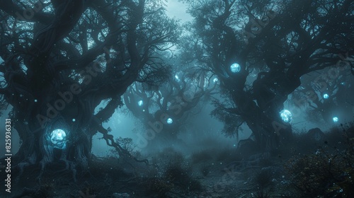 Fototapeta premium Shadowy forest with contorted trees, glowing blue orbs floating, thick fog,...