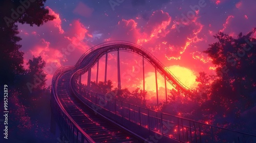 © ChrisTYCat, Obraz premium Shadowy Roller Coaster Tracks Winding Through the Vibrant Sky at Sunset