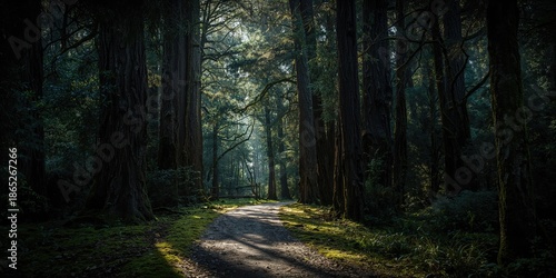 © The 2R Artificiality, Obraz premium Shadowy woodland pathway with towering trees, highlighting seasonal change in a forest setting