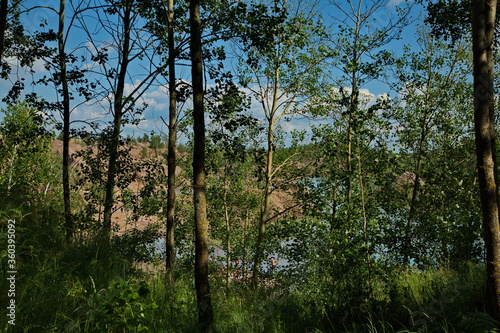 Obraz premium Shady forest on the shore of a forest lake.