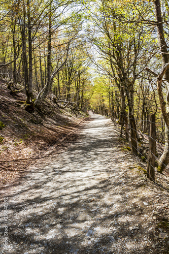 Obraz premium Shady May beech tree path on the French Napoleon Route in the Spanish Pyrenees Mountains