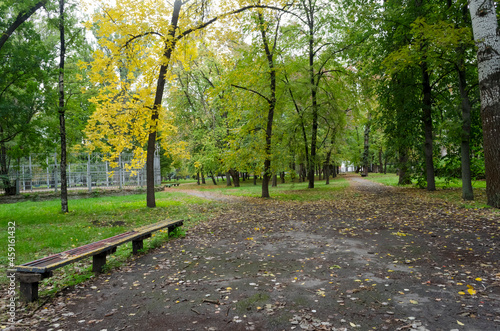 Naklejka premium Shady trees, gilded in autumn, a bench on the park alley, dotted with autumn...
