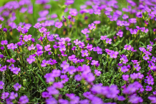 Naklejka premium Shallow depth of field photo (only couple of petals in focus) of purple flowers - and green stalks. Abstract spring background.