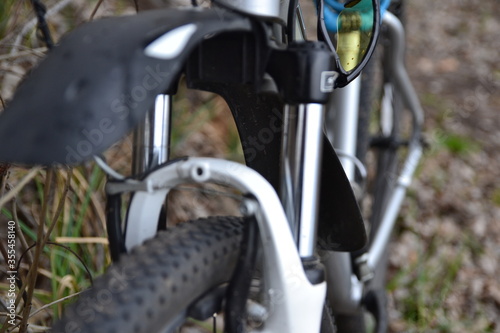 © Ruslan, Fototapeta premium Shallow focus photography of bicycle tire. Bicycle fork.