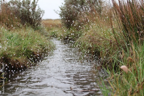 Obraz premium Shallow stream flowing through grassy marsh, water droplets splashing