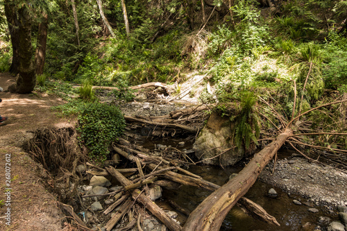 © Yi, Obraz premium shallow stream run through rocky creek deep inside forest in a park with dense bushes and falling tree trunks on the ground