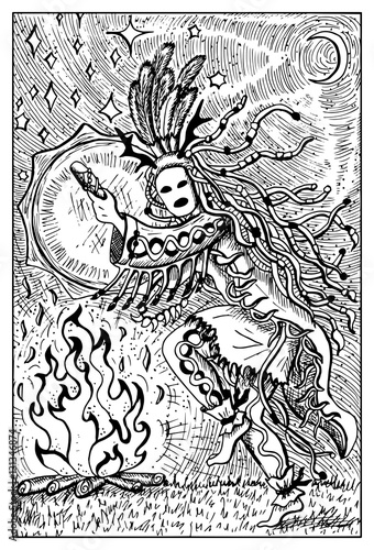 © samiramay, Fototapeta premium Shaman with drum. Engraved fantasy illustration