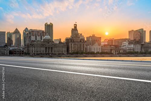Obraz premium Shanghai bund city skyline and empty asphalt highway at sunset