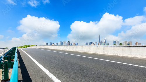 © ABCDstock, Naklejka premium Shanghai city skyline and famous landmark buildings with empty asphalt road