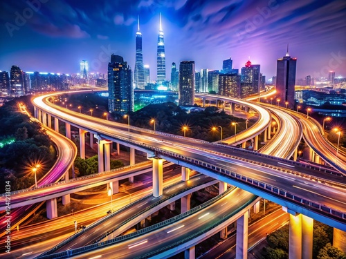 © Arnada, Fototapeta premium Shanghai Night: Elevated Road Junction & Interchange Overpass Bokeh Photography