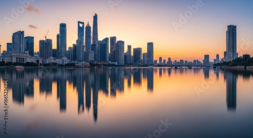 © Ning, Fototapeta premium Shanghai Skyline Reflection at Sunset, Cityscape, Water, Buildings.