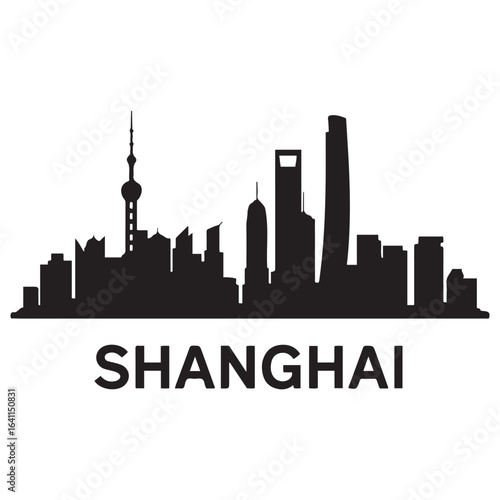 © Nargis, Naklejka premium Shanghai skyline silhouette. Landscape Shanghai, China. Vector illustration. Vector black silhouette. with white background.