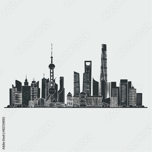 © Bima, Naklejka premium Shanghai Skyline Silhouette Modern Cityscape Illustration.