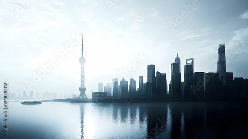 © Roni Yahdi, Obraz premium Shanghai skyline sunrise, hazy river reflection, city travel