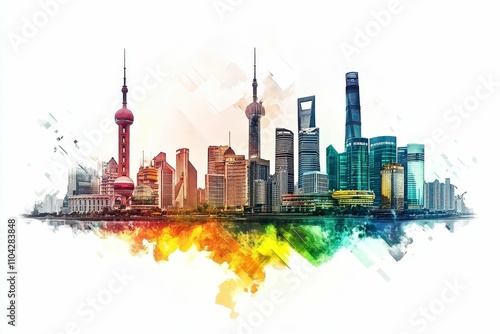 Obraz premium Shanghai skyline, watercolor style, vibrant colors.