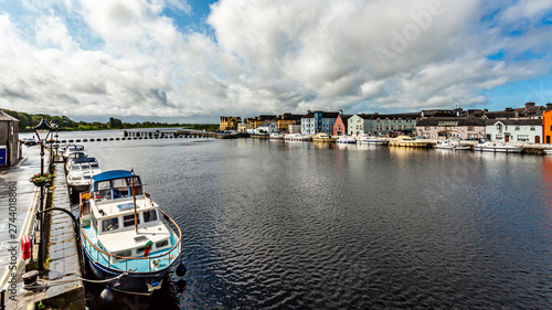 © Emile, Fototapeta premium Shannon river with boats anchored at docks, cityscape with quaint houses in Athlone town in the background, cloudy day with cloudy blue sky in County Westmeath, Ireland