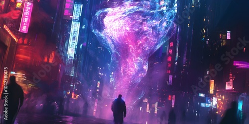 © Siriroj, Fototapeta premium Shapeshifting Energy Beings in Futuristic Digital Cityscape with Intricate Light Patterns