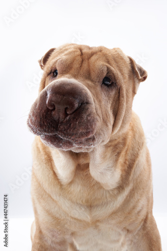 © Anna Averianova, Obraz premium Shar Pei on white background. The dog smiles, funny face