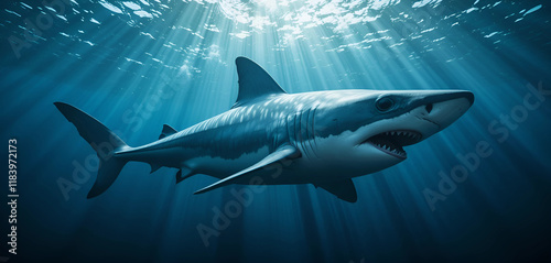 © Hanuman, Fototapeta premium Shark "A powerful great white shark slices through the ocean's depths, its streamlined body and sharp teeth illuminated by scattered rays of sunlight. Its sleek.