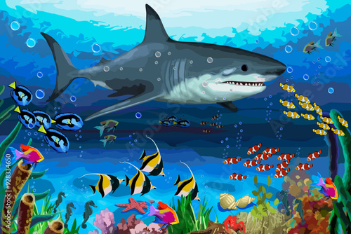 Fototapeta premium Shark and flocks of colorful fish.Vector illustration with a shark and flocks of fish and animals underwater.