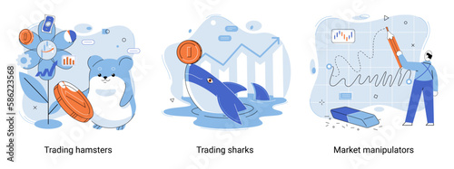 © Dmytro, Naklejka premium Shark emerges from water and holds gold coins on its nose. Trading hamsters and whale metaphor set. Fake data for business valuation. Inexperienced investor, bad investment, experienced traders