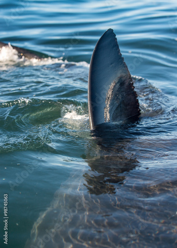 © Uryadnikov Sergey, Fototapeta premium Shark fin above water. closeup Fin of a Great White Shark (Carcharodon carcharias) in ocean water.