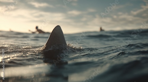 Fototapeta premium Shark fin emerges from ocean water with blurred surfers in the background....