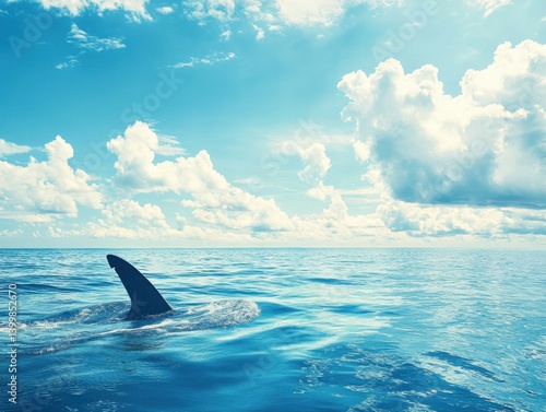 Fototapeta premium Shark fin emerging from tranquil blue ocean under a bright sky with fluffy white clouds serene seascape adventure