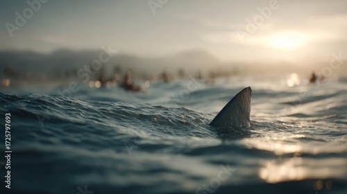 Fototapeta premium Shark fin in water at sunset with blurred background. Dangerous marine animal swimming near ocean surface. Summer vacation, fear concept.