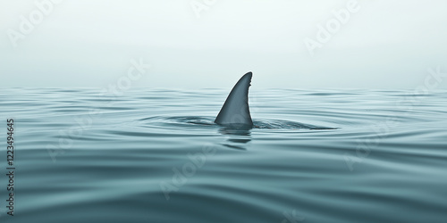 Naklejka premium Shark fin swimming in the ocean creating ripples in a foggy morning