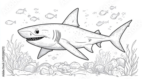 Fototapeta premium Shark fish illustration for a coloring book page, cute and funny sea or ocean underwater animal, with a cartoon design and outline for kids, highlighting marine life in an educational art drawing.