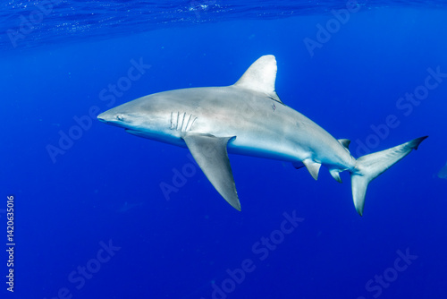 © Gary, Fototapeta premium Shark glides through the deep blue waters off the coast of Hawaii.