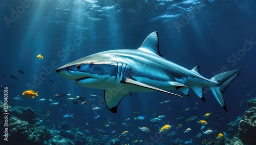 © CreativeBro, Obraz premium Shark in the deep blue ocean. Underwater shark.