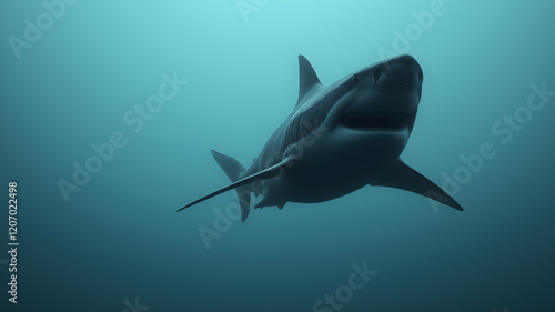 © Tark, Naklejka premium Shark in the sea, dramatic foggy photo. Generative AI