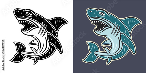 Naklejka premium Shark in two styles monochrome on white and colorful on grey background vector illustration