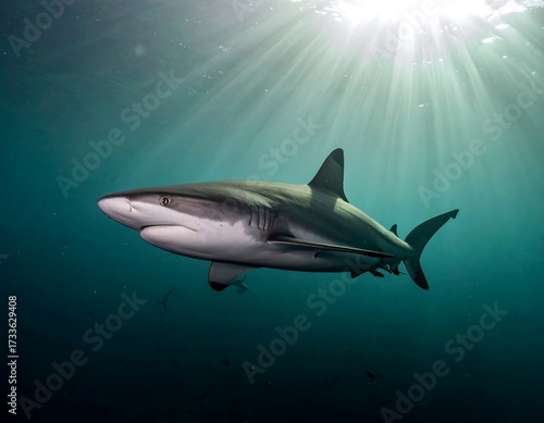 Fototapeta premium Shark in underwater sunbeams